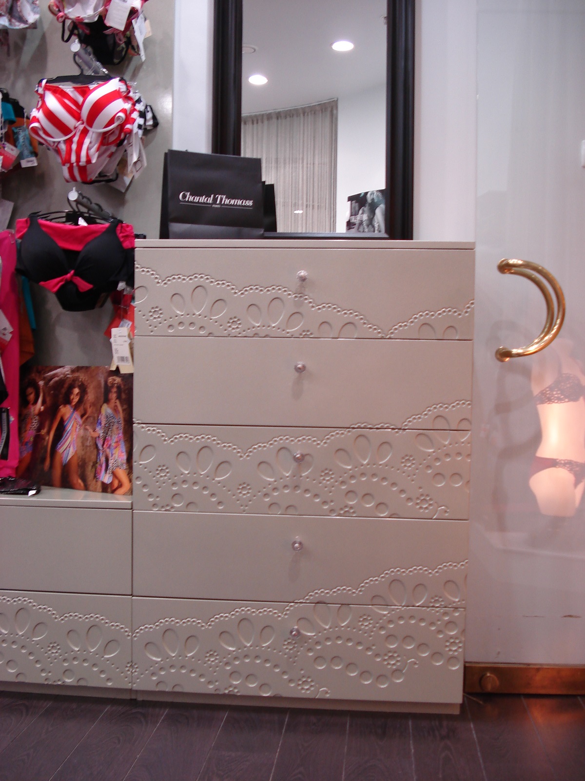 Дизайн магазина ЭлитЛ Якиманка сложный, насыщенный большим количеством декораторских решений. Площадь магазина 127м2. Роскошные полы из матовой керамической мозаики стального цвета достались этому дизайн проекту от предыдущего арендатора торговой площади – и это шикарный подарок! Оформление магазина: потолки было решено не зашивать, а задуть вместе со всеми трубами и проводами в белый цвет; полы без изменений. В магазине огромная витрина. Тема белья для витрин очень тонкая – у нас 3 манекена: 2 девушки и мужчина. Витрина отгорожена от торгового зала панно из прозрачного акрилового стекла, рисунок - кружево. По проекту магазина свет приглушенный: огромная люстра висит над круглым бархатным пуфом, есть шины света по периметру над накопителями. Бельевые накопители фисташкового цвета с металлической искрой. По фасаду на выдвижных ящиках накопителей – акриловые панно и это тоже кружево. В простенках между накопителями – декоративные панно. Рама из серебряной мозаики, а внутри декоративные штукатурки с поталью. Касса имеет графический декор из мдф, переходящий со столешницы на фасад. Полочку для сумок покупателей поддерживают две огромные балясины ручной работы. Это одна из удачнейших работ нашей студии дизайна интерьера.