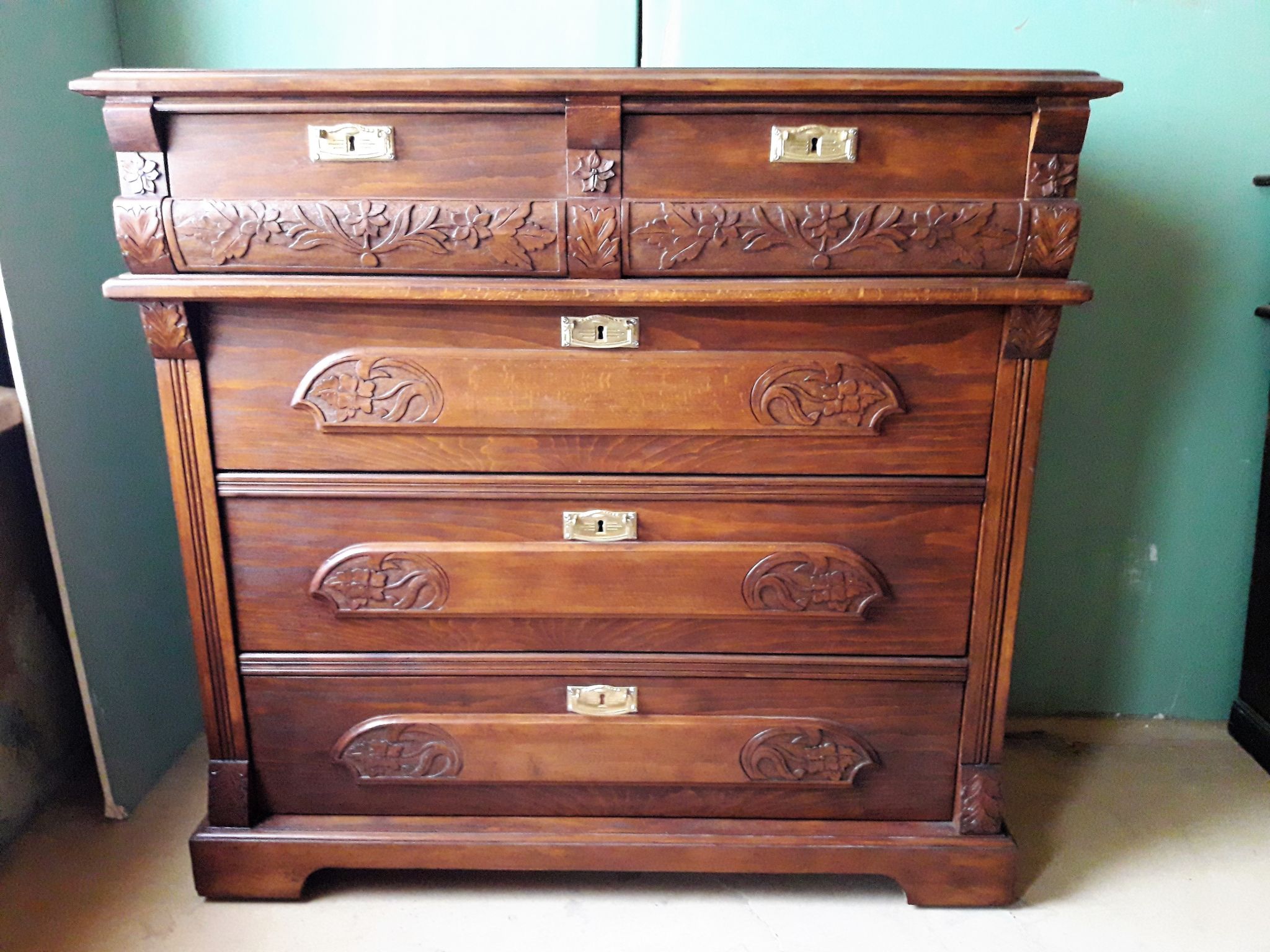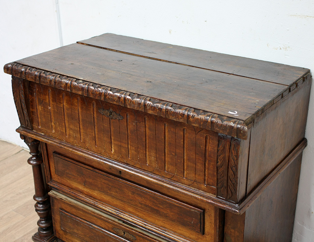 Первое, что надо было сделать — изготовить отсутствовавшие детали. Мы заказали одним нашим партнерам точеные детали и другим — резную капитель и плинтус. Эти элементы были сделаны из липы. Комод также был сделан из липы и даже приятно пах, что большая редкость для старинной мебели. Таким образом у нас было 5 оттенков древесины: новая липа — точеные и резные элементы, старая липа — стенки и 2 нижних ящика комода, новая сосна — нижняя обвесь, резные накладки и фасад верхнего ящика. Мы посчитали, что фрагментарная покраска соберет все элементы во едино.
