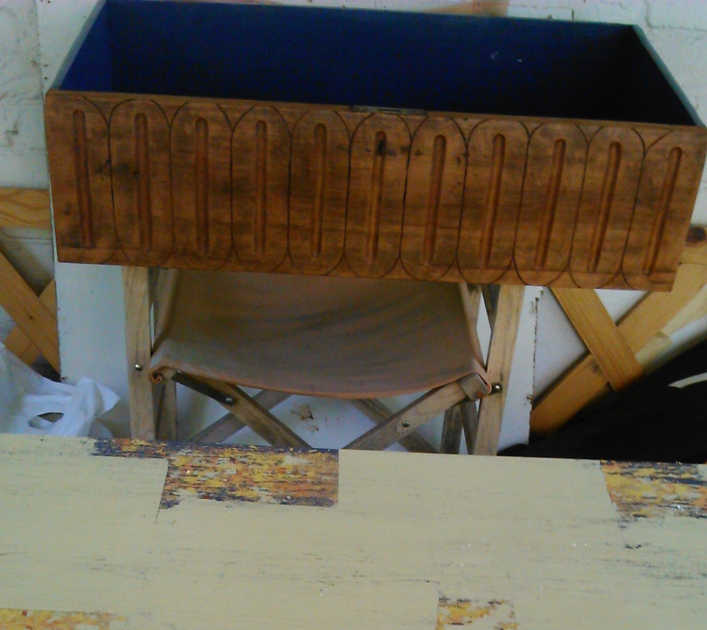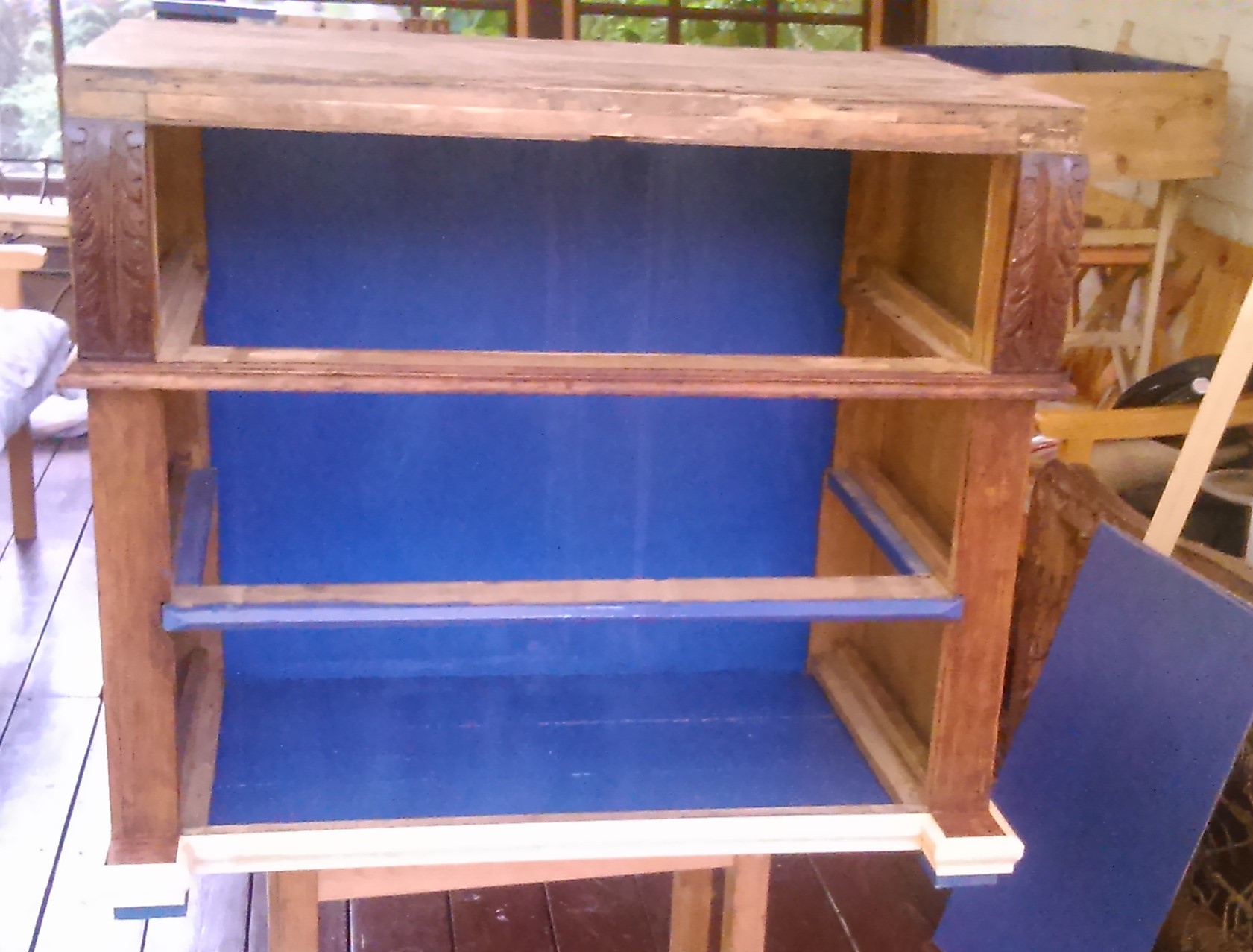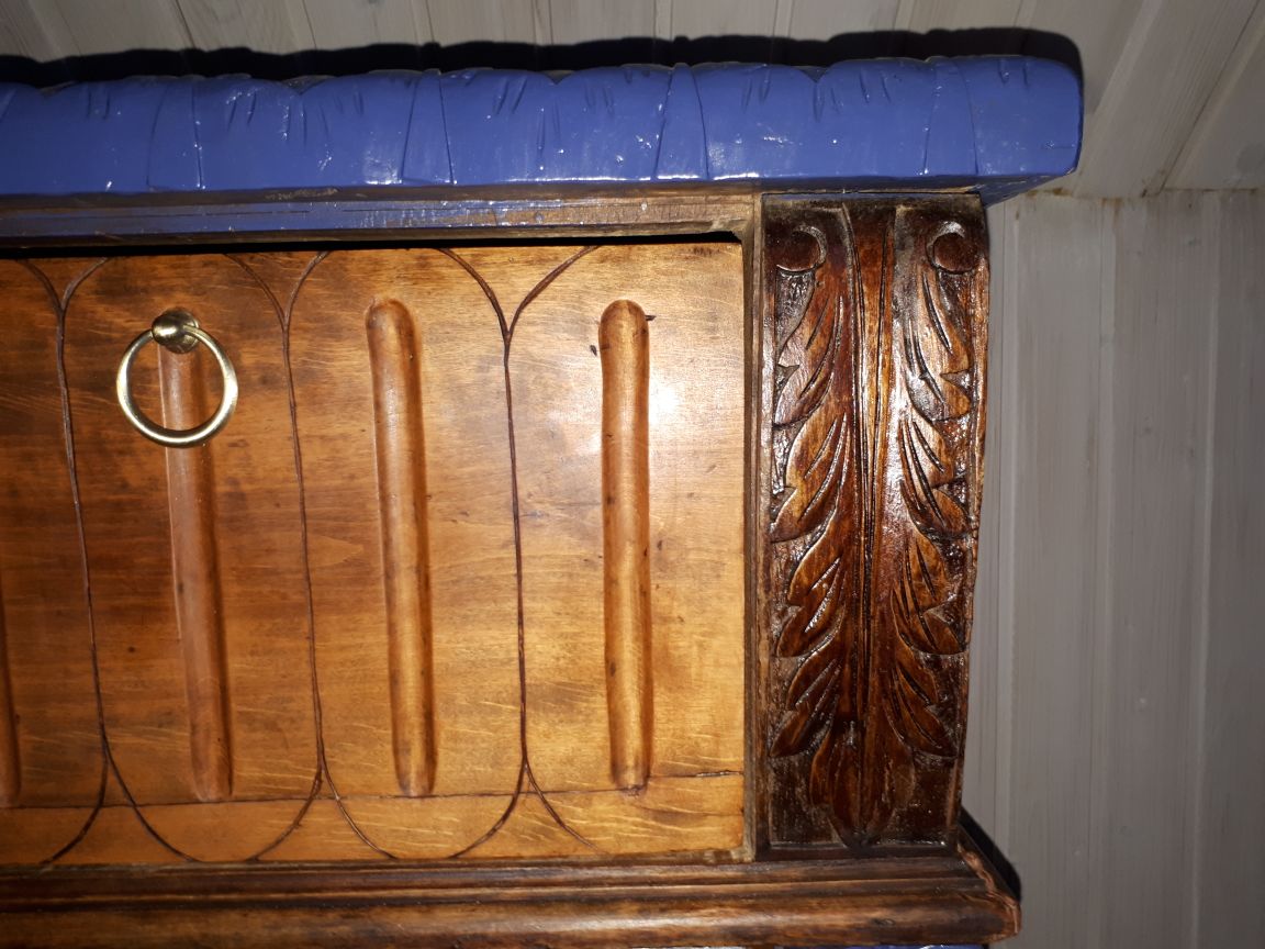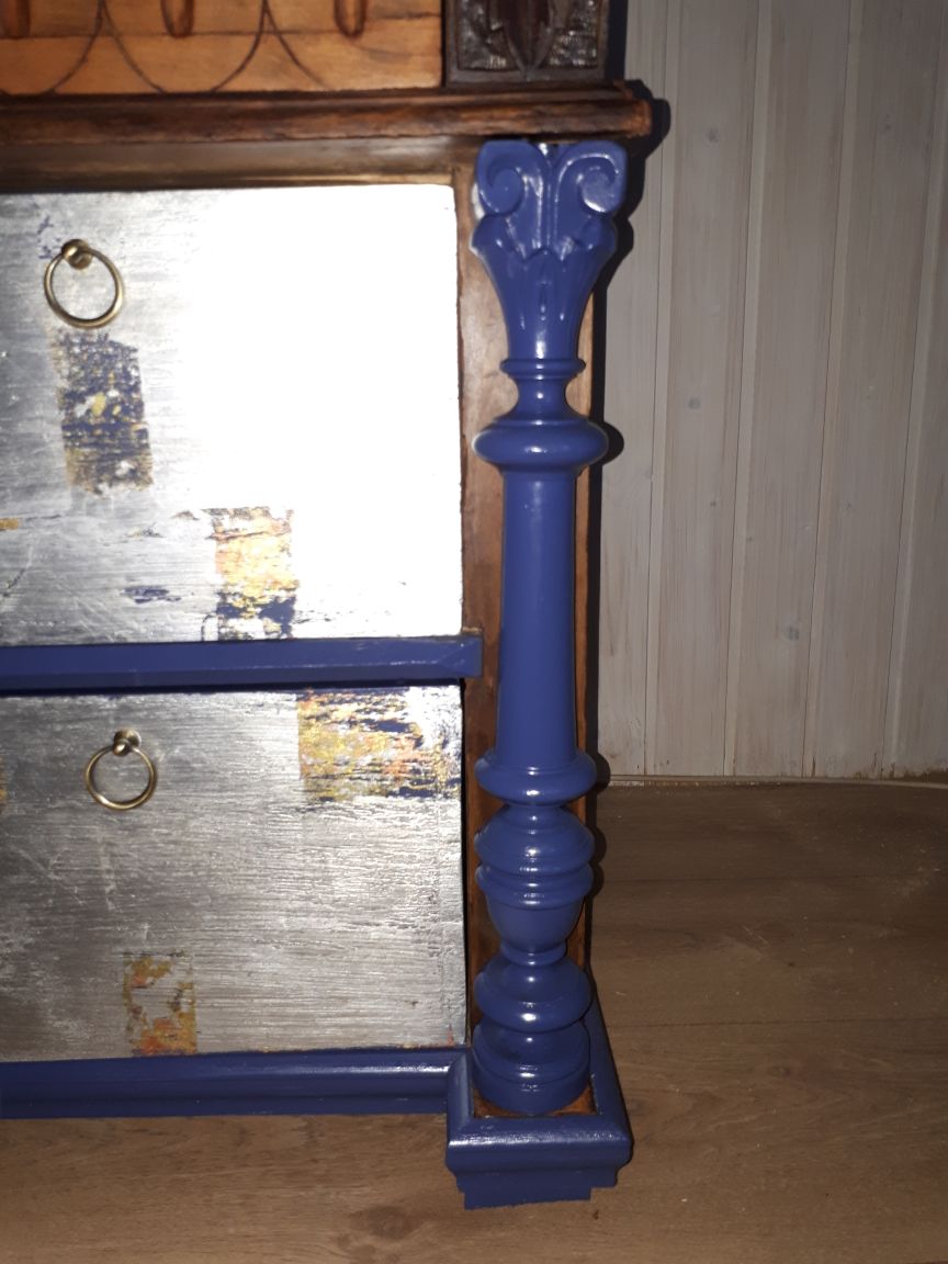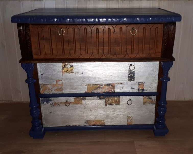 Фасады ящиков декорируем серебряной и золотой поталью по синему фону. Деревянные детали после очистки и шлифовки покрываем цветным мебельным воском.