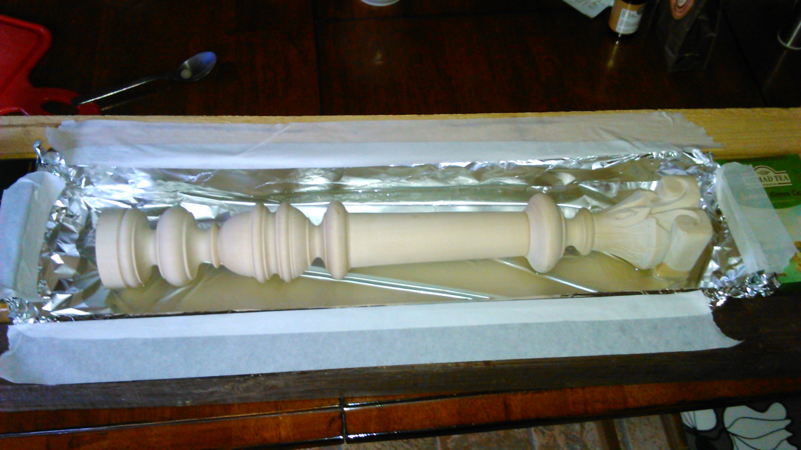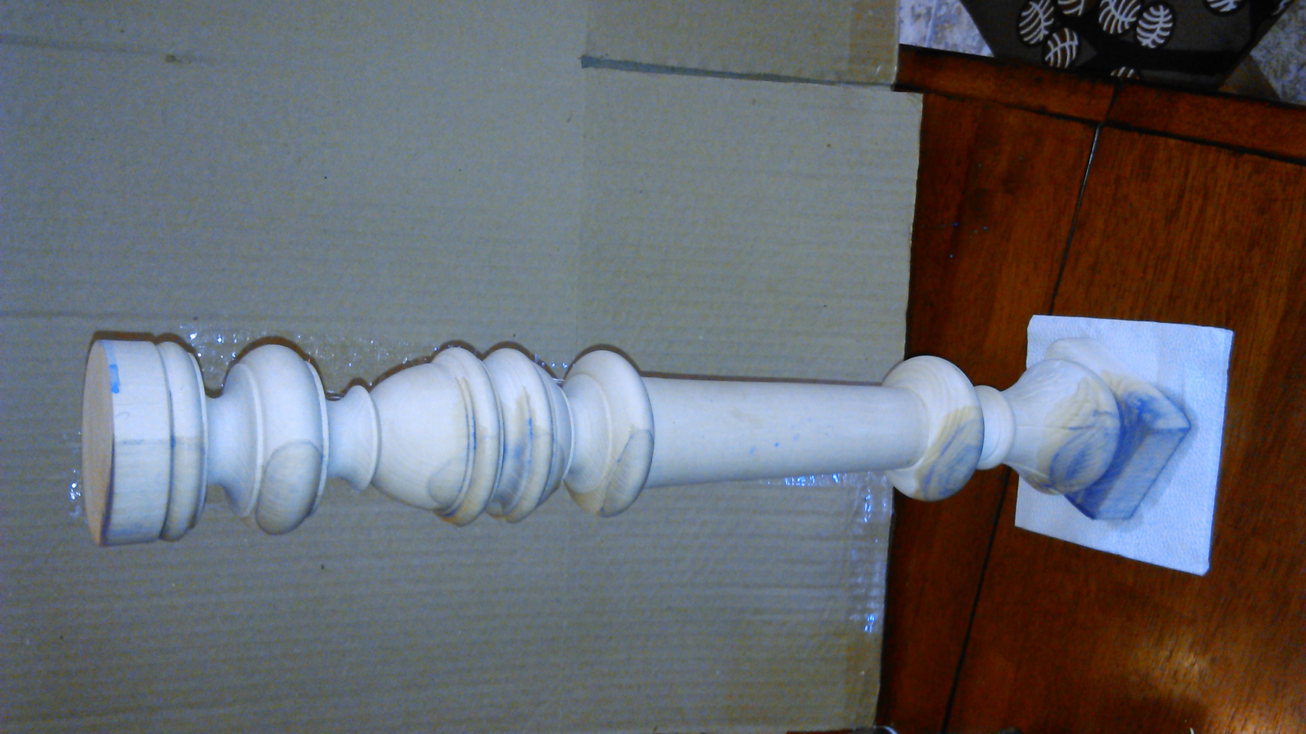 Оригинальная колонна не является накладкой. Колонна примыкает к стене комода и упилена на 1-2 см по всей высоте, но создается впечатление, что это полноценный, отдельно стоящий элемент. Если бы у комода были накладки с каждой стороны в виде полуколонны, то задача была бы проще, такой вариант декорирования встречается очень часто. Как урезать по высоте колонну, по всем точеным элементам и обеспечить такое же примыкание, как и у оригинала? Мы придумали следующее: отметили карандашом на новой колонне и на капители, и базе сколько надо отпилить, взяв размер с оригинала; положили колонну в лоток по уровню — горизонтально; в лоток налили воду, окрашенную гуашью. Краска перенесла на все точеные элементы отметки для запила.