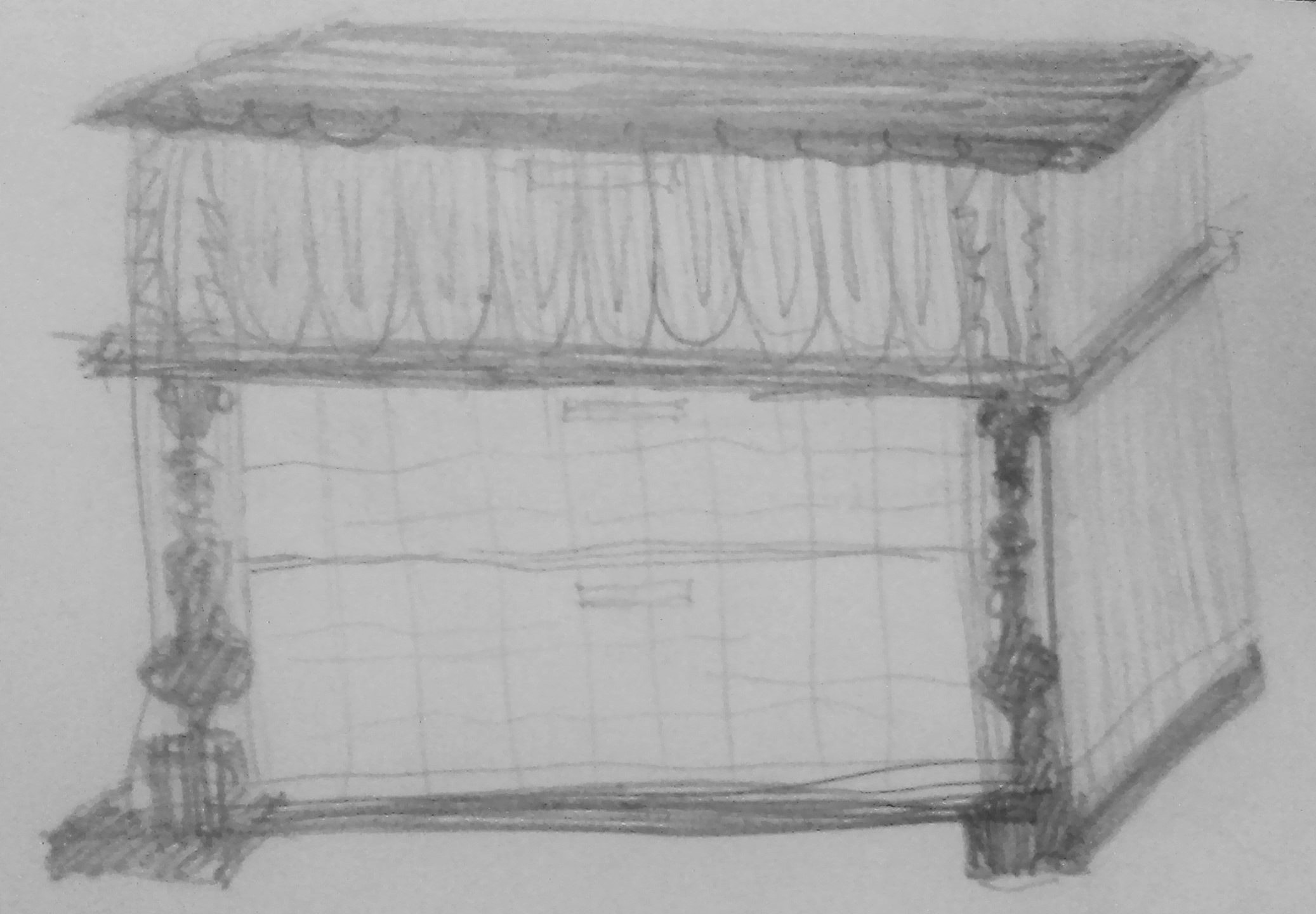 Комод был без правой полу-колонки и резного плинтуса столешницы, с частичными утратами декора на нижнем ящике. Комод был весьма грязный, рассохшийся и по основанию изрядно попорчен древоточцем. Речь о строгой реставрации не шла. Рассмотрев комод, мы увидели, что изначально он был существенно сложнее, чем мы его видим сейчас. Например, у него была когда-то фанеровка на столешнице; качество резьбы накладок гораздо выше чем резьба по верхнему ящику, что позволяет предположить, что верхний ящик изготовили относительно недавно, и многое другое. Нужно было создать интересный комод на основе купленного. Сейчас мебельщики много фантазируют, делают что-то с улыбкой и юмором, отдавая дань традиции, мебель не всегда окрашивают в цвета пород дерева. Возможно все: и частичная покраска, и декупаж, и роспись, и внесение совсем неожиданных элементов — все это допускается. Клиентка не хотела получить однотонный, как она сказала «серьезный комод», она хотела что-то веселое и живое. Быстрый эскиз — отличная помощь в работе. Надо было принять решение какие элементы будут окрашены, разобрать на темное и светлое, с учетом утрат и вновь изготовленных