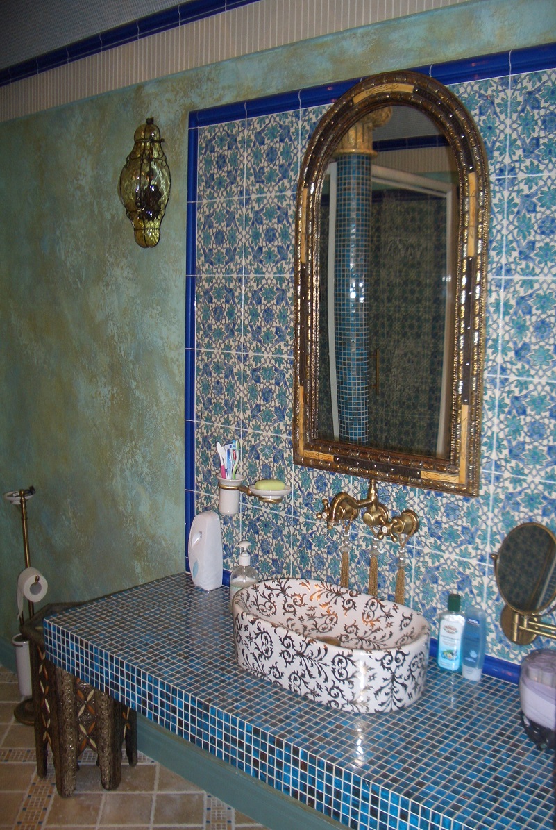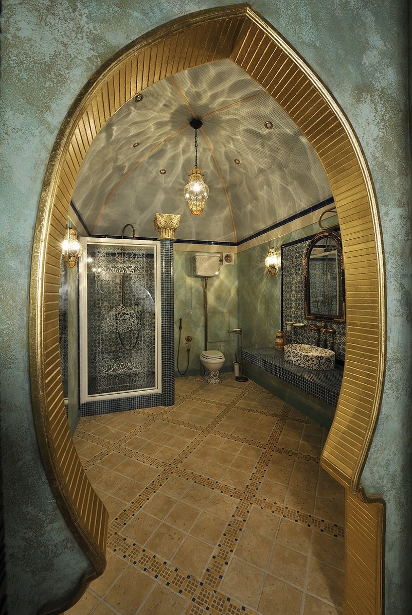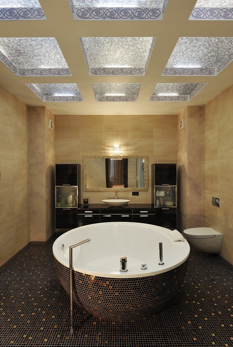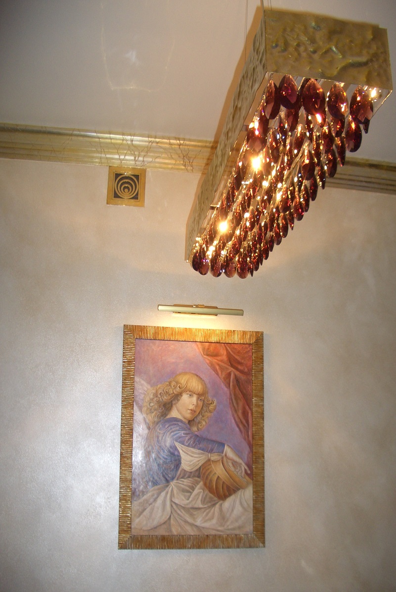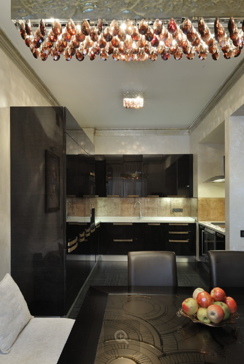 Наша студия дизайна интерьера создала богато декорированное, но в то же время, очень эстетичное пространство. Стилистически дизайн интерьера квартиры ближе всего к ар-деко. Современный интерьер позволяет смешение стилей и направлений. Роскошный холл с декоративными штукатурками и золочеными карнизами, с интересной консолью и копией фрески «Ангелы-Музыканты» Мелоццо да Форли (1438-1494). В гостиной расположился огромный кожаный диван. В столовой удобный обеденный гарнитур с раскладным столом, что так редко встречается в итальянской мебели. Дизайн интерьера дома элегантно дополнен кухней с черно-лиловыми фасадами с серебристой искрой. Цвет кухни полностью зависит от освещения. Кухонный фартук выполнен из золотых стеклянных пластин. Вход в гостевой санузел через мавританскую арку. Дизайн интерьера ванной напоминает, возможно, Марокко. Спальня серебристо – лиловая очень нежная по цвету и фактурам. В хозяйской ванной комнате по центру расположена круглая ванна с мозаикой. Закарнизный свет, стеклянная мозаика и росписи по кесонированному потолку создают ощущение, что в ванную комнату проникает солнечный свет.