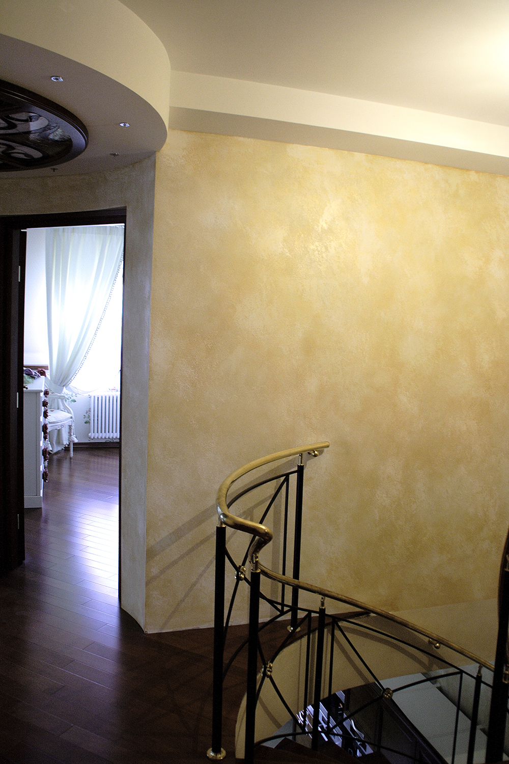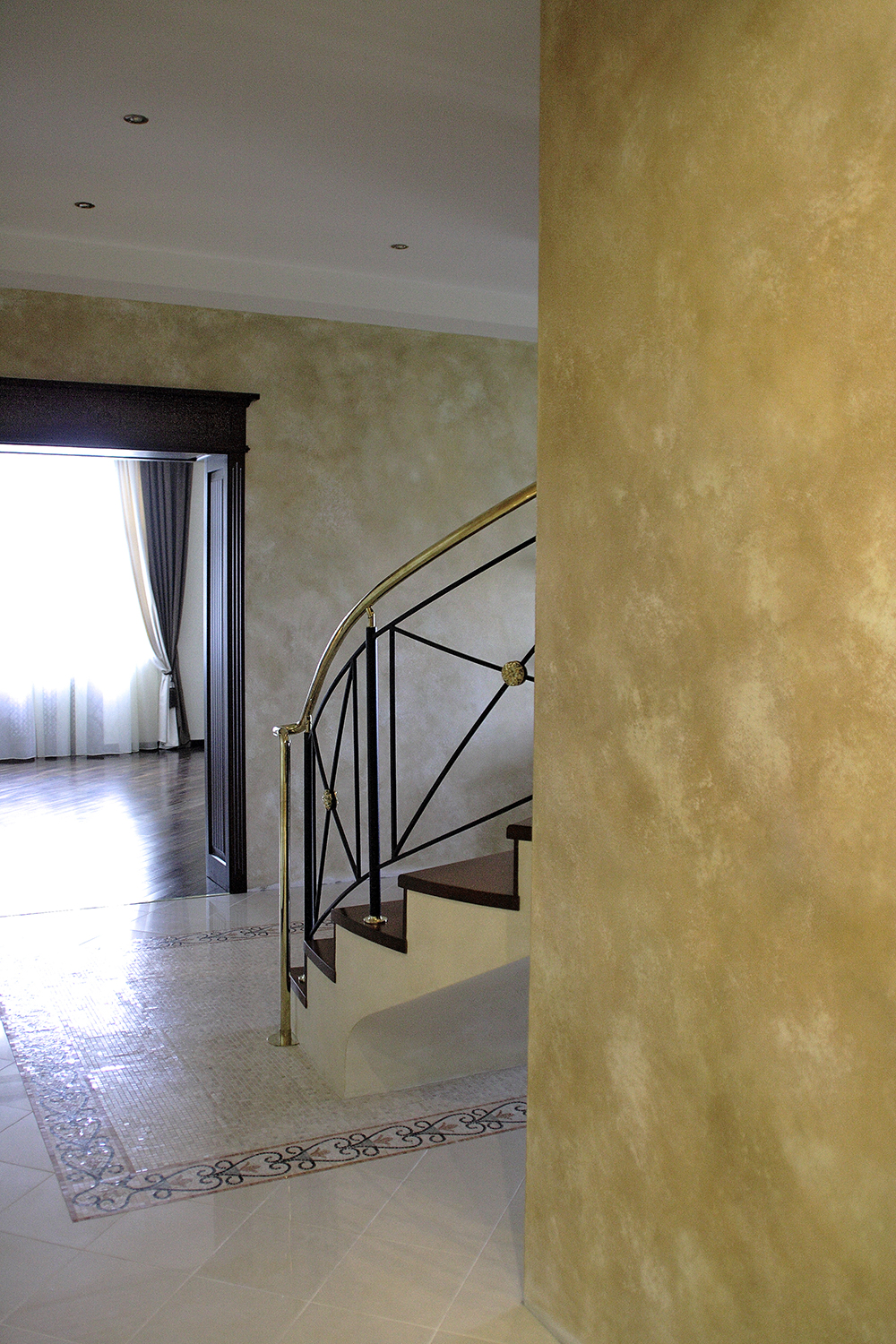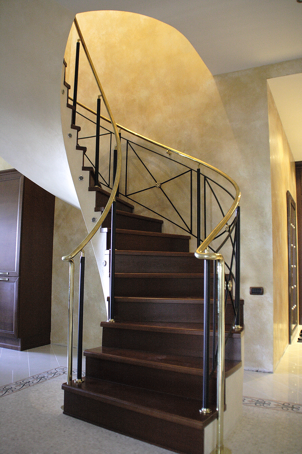 Дизайн проект интерьера двухэтажной квартиры всегда зависит от дизайна лестницы как стержня дома. На первом этаже – большой холл, гостевой санузел и монолитная лестница на изогнутом косоуре. Лестницу и ее декор спроектировала наша студия дизайна интерьера. Под нашим руководством ее отливали и декорировали: свет, деревянные ступени, латунные перила и ограждения. На полу перед лестницей мраморный ковер. Далее огромная многофункциональная кухня и гостиная. В глубине первого этажа кабинет.