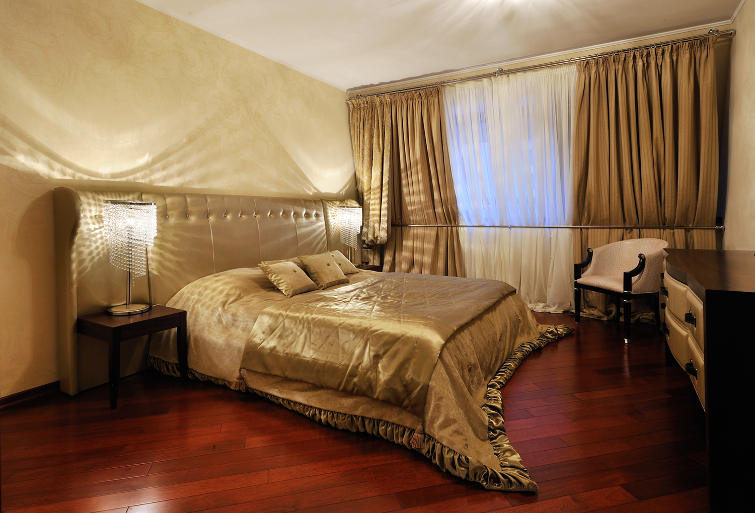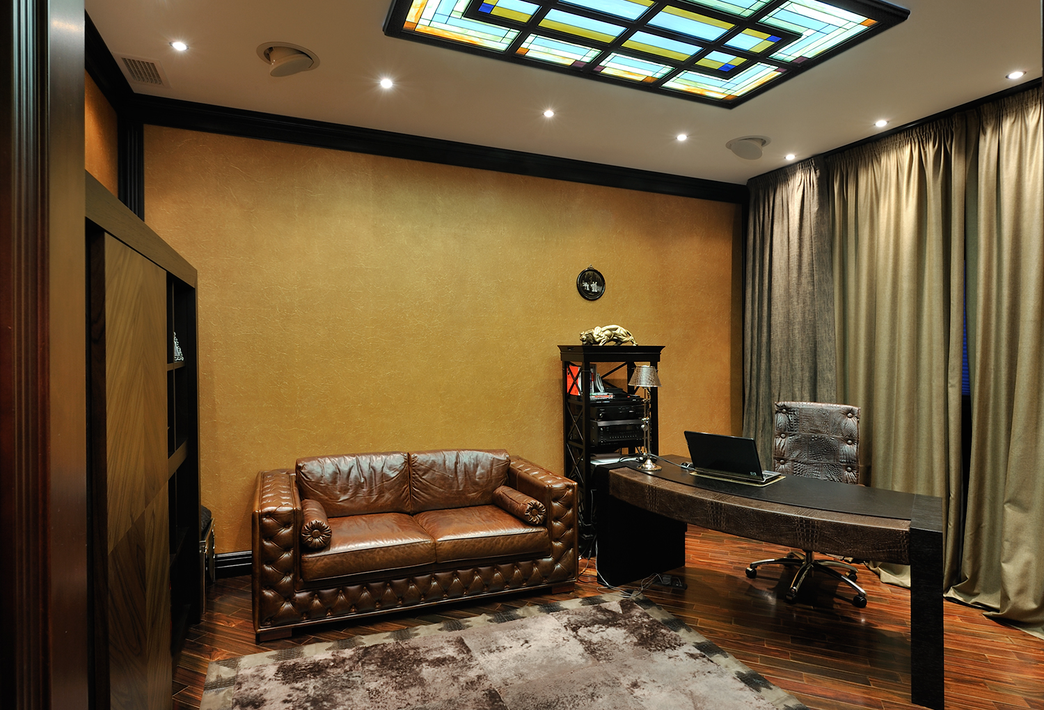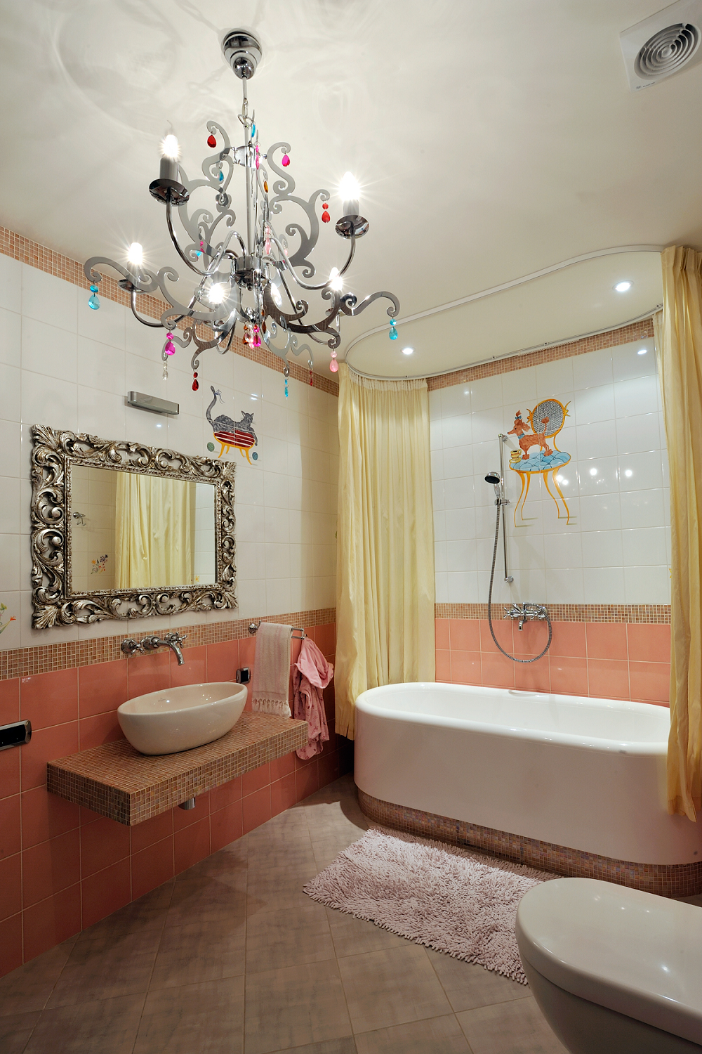 Дизайн интерьера квартиры полон интересных деталей: мозаики, мозаичный ковер, светильники и люстры, интересная мебель.